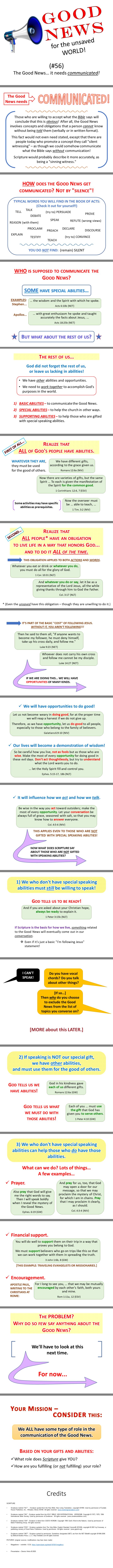 When it comes to the Good News, all of God's people have certain responsibilities. This does not mean we all have special evangelistic abilities; but it focuses on certain attitudes and obligations that must influence our thoughts and actions.